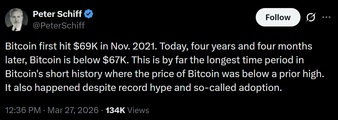 “Bitcoin atingiu US$ 69 mil pela primeira vez em novembro de 2021”, publicou Schiff. “Hoje, quatro anos e quatro meses depois, o Bitcoin está abaixo de US$ 67 mil. Este é, de longe, o período mais longo na curta história do Bitcoin em que o preço ficou abaixo de uma máxima anterior. Isso também aconteceu apesar do hype recorde e da chamada adoção.”