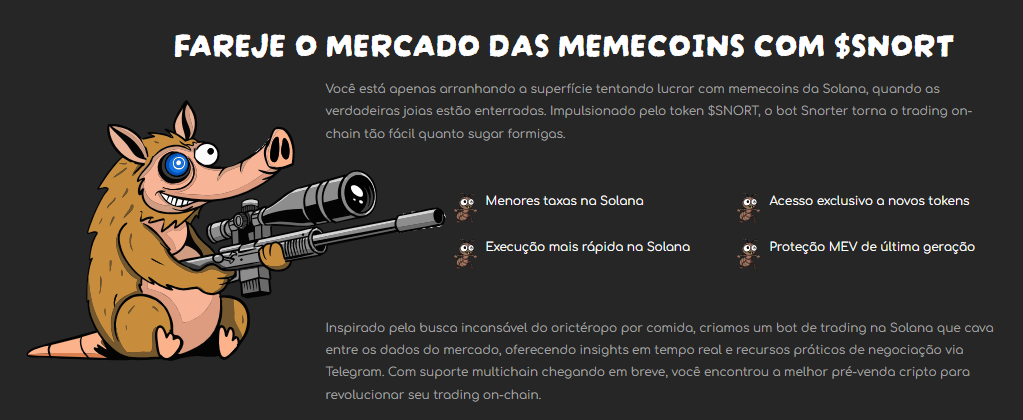 Um exemplo é o Snorter Bot, que promete oferecer soluções de trading automatizado no Telegram para quem atua no mercado de memecoins. A proposta inclui recursos como o sniping de lançamentos em segundos, algo extremamente útil em um ambiente volátil.