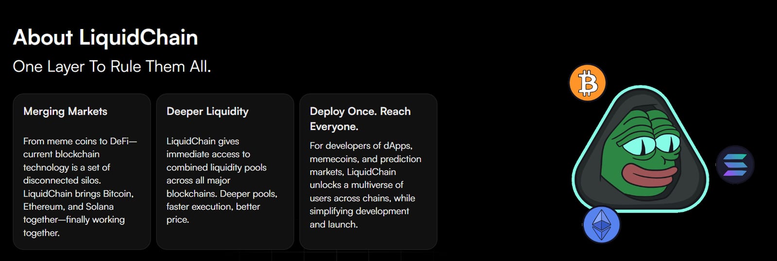 A LiquidChain ataca diretamente esse ponto de dor ao criar uma única camada de coordenação que agrega liquidez e poder de execução das três redes, tornando-se altamente relevante à medida que participantes institucionais e de varejo exigem cada vez mais interoperabilidade sem fricção em um mercado em amadurecimento.